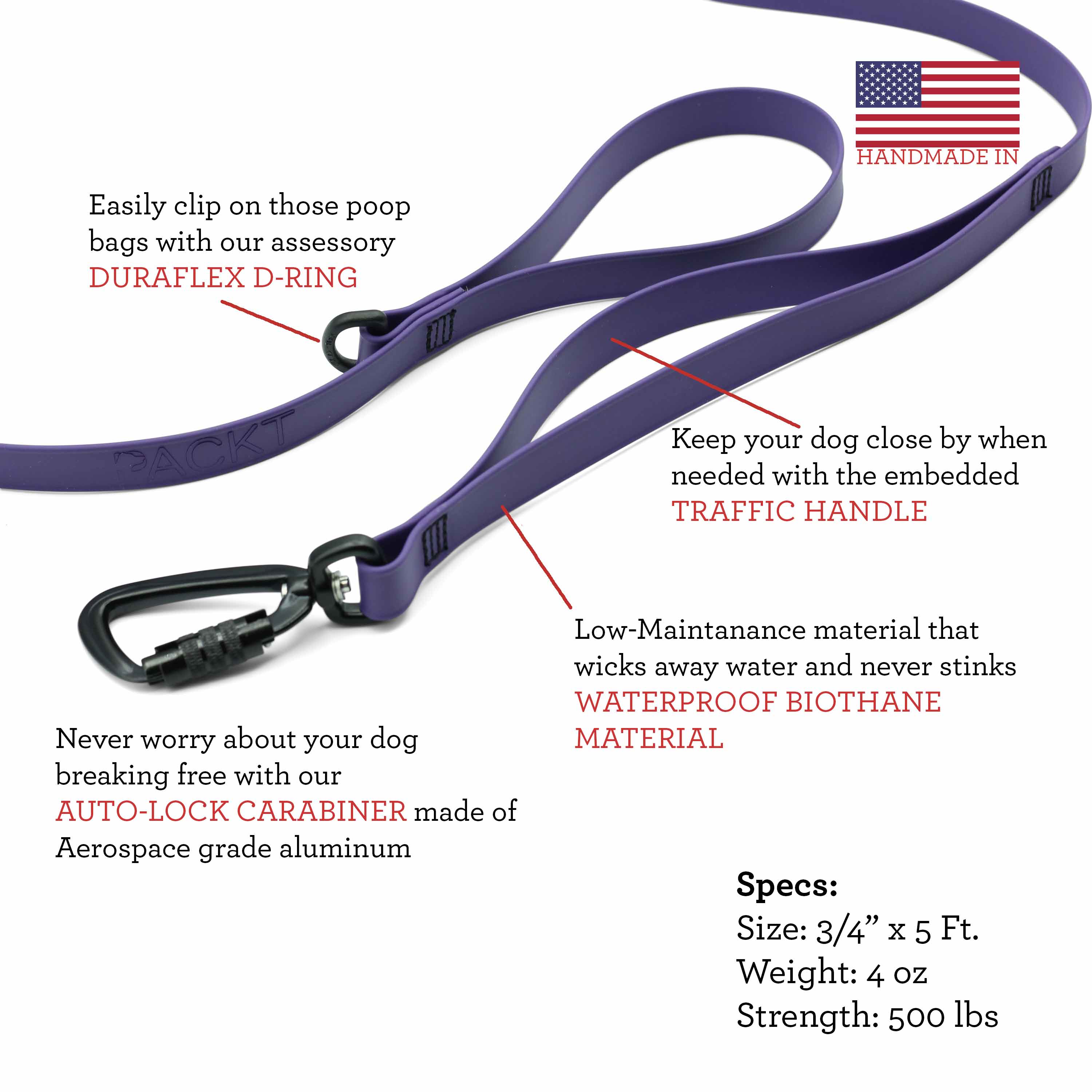 When designing this this leash, we put the focus on safety, durability, and pack-ability. At only 4 oz. this 5 ft. leash can still handle over 600 lbs. of pull and features an embedded traffic handle, autolocking carabiner, accessory d-ring, and of course biothane beta waterproof material.